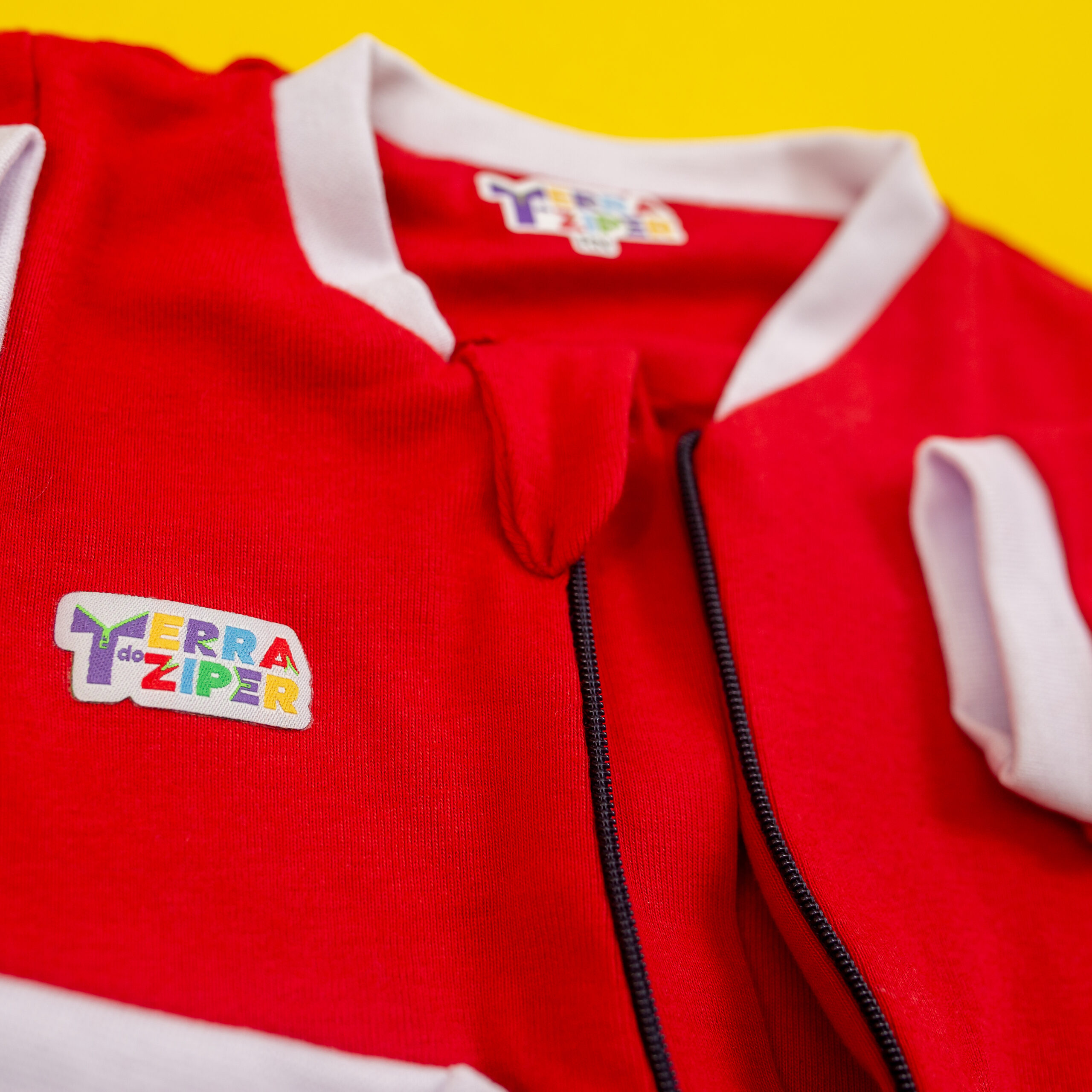 Macacão Suedine Vermelho Com Gola Punho Branco E Zíper Azul Marinho